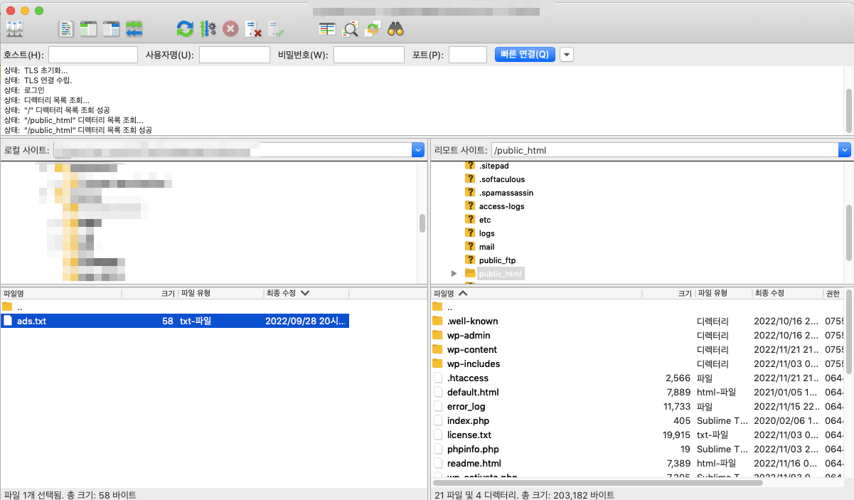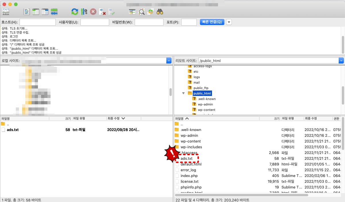 위에서 구글 애드센스를 통해서 다운받았던 ads.txt파일이 여러분의 컴퓨터에 저장이 되어 있을텐데요. 이 파일을 여러분의 호스팅 루트 디렉토리에 업로드해주시면 된답니다...