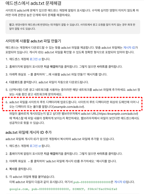 그리고 애드센스에서 제공하는 ads.txt파일 관련한 공지사항들을 차근차근 읽어보시면 도움이 됩니다... 애드센스에서 ads.txt파일 관련한 문제가 생겼을 때 해결법대로 따라하면 되는데요. 위 화면에서 네모박스 부분대로 해 주면 된답니다.