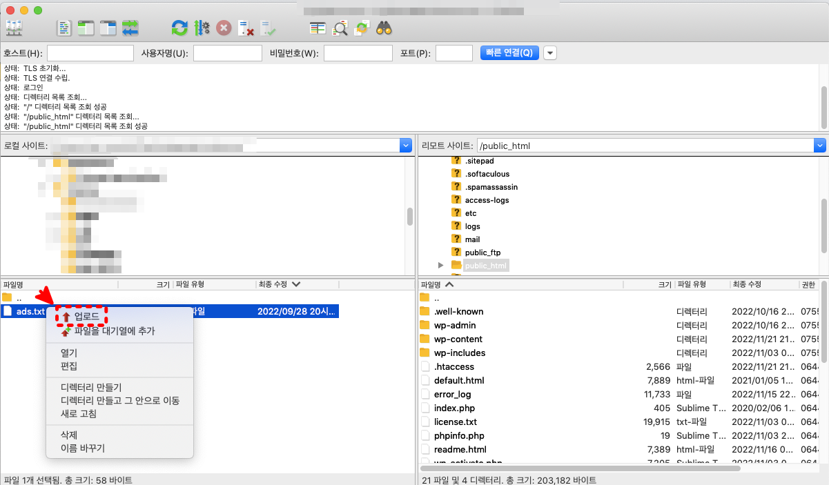 워드프레스 사이트의 루트 디렉토리는 대부분 public_html이나 www 폴더입니다. 이곳에 위 화면처럼 ads.txt파일에 커서를 대고 우클릭하면 목록이 나타납니다. 여기에서 [업로드]를 클릭해 줍니다.