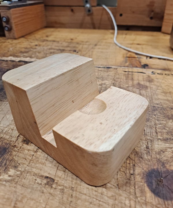 원목 고무나무 폰 거치대의 측면 모양입니다...적당한 각도로 기울어져 있어서 폰을 세워두면 보기에도 편리할 듯하네요...