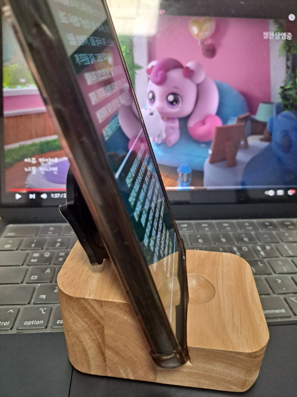 스마트폰을 고무나무 폰 거치대에 올려놓은 채로 옆 사진을 찍어 보았습니다. 거치대 각도가 약 100도 정도로 눕혀져서 독서하기에 적당한 각도가 나오더라고요. 맥북 화면이 배경으로 나왔는데요. 저 눈망울 크고 예쁜 하츄핑 너무 귀엽죠?ㅎㅎ