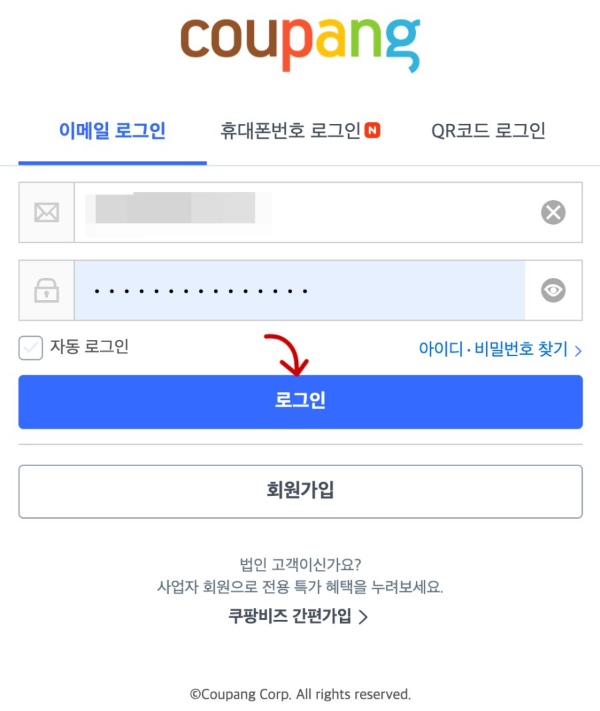 대부분 쿠팡 회원 아이디를 하나쯤은 가지고 계실 텐데요. 기존 아이디로 가입하시거나 새롭게 계정을 만드실 수 있습니다. 저는 기존 아이디로 가입해 볼게요.