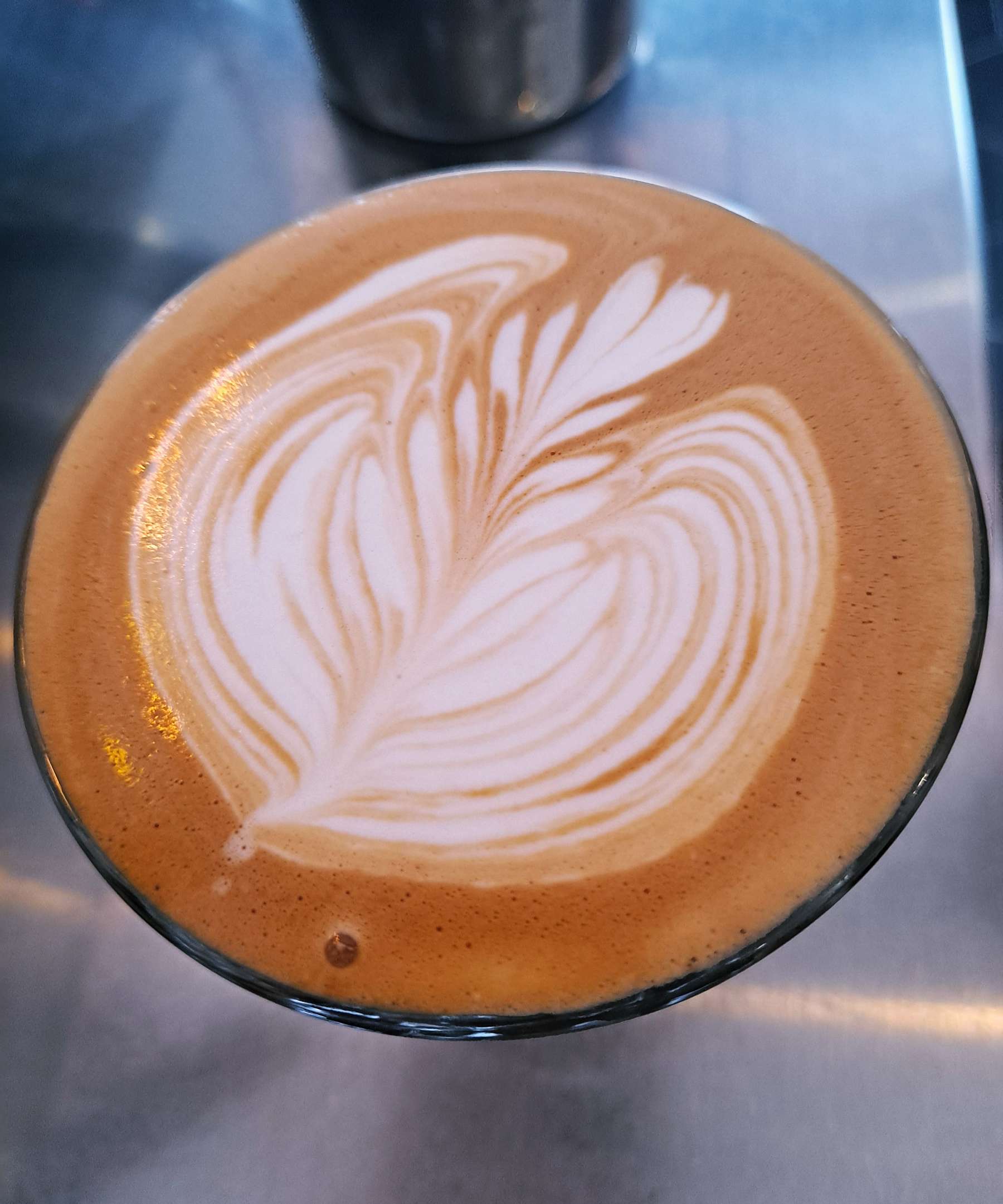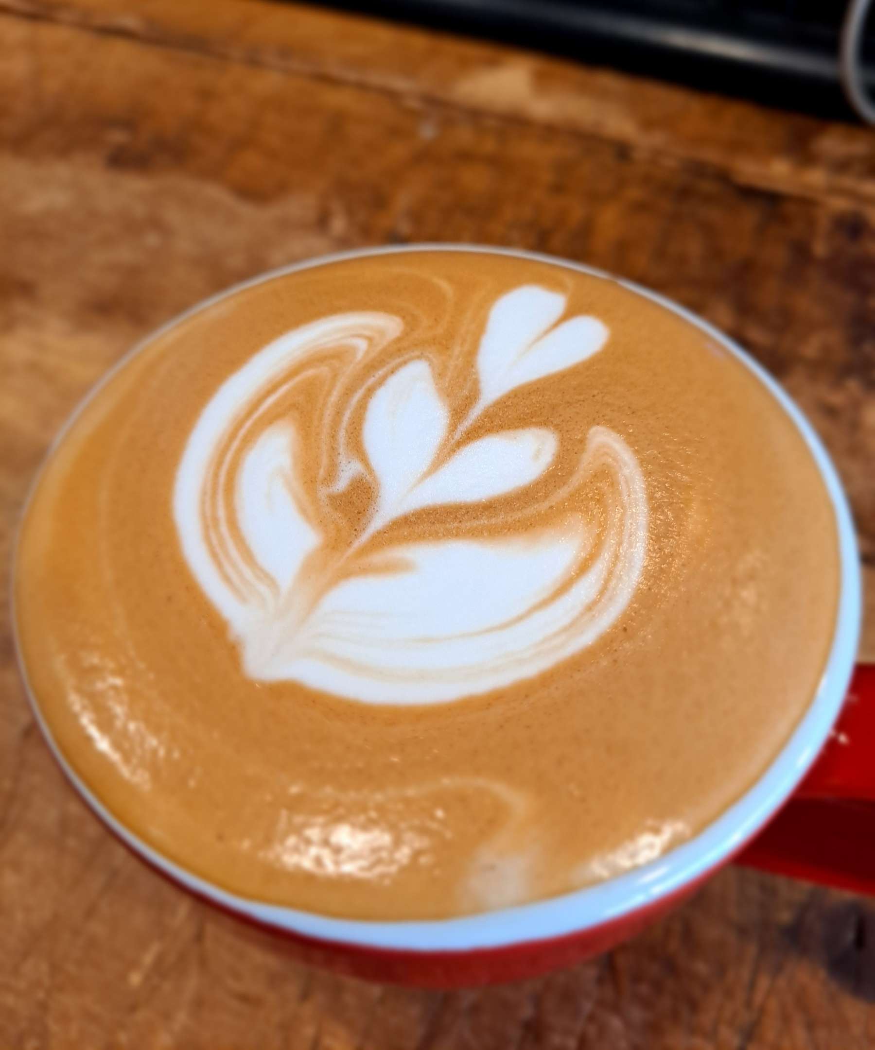 손님들에게 제공되는 레드톤의 플랫화이트 잔에 '3단 윙 튤립'을 시연해 보았습니다...