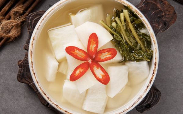 겨울에 시원하게 먹는 동치미는 구강내의 산성환경을 중화시켜 주는 성분으로 인해 충치예방에 좋습니다. 동치미에 함유된 유황 아미노산은 노화와 암을 유발시키는 활성 산소를 억제하며 손상된 세포 DNA를 원상태로 회복시켜주는 효능이 있다고 해요. 그리고 해독을 도와주는 베타인 성분이 함유되어 숙취해소, 간보호에도 좋다고 합니다.